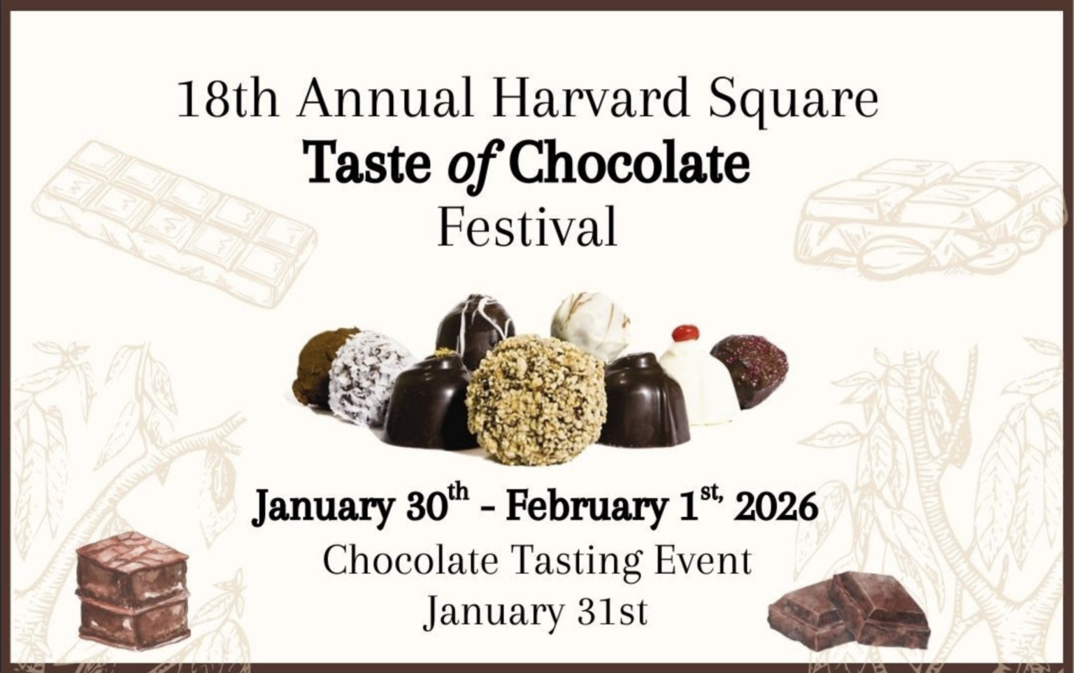 The wait is finally over! The Harvard Square Business Association is delighted to announce the return of its 18th Annual Taste of Chocolate Festival! From January 30โFebruary 1, Harvard Squareโs restaurants and cafes will embark on a three-day chocolate extravaganza! Restaurants will feature chocolate desserts and cocktails while Harvard Square retailers will be running scrumptious chocolate specials and deals.
