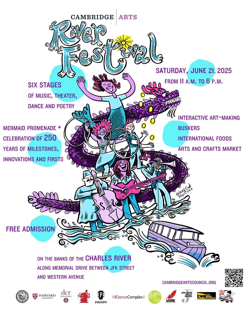 Experience the Cambridge Arts River Festival along the banks of the Charles River in Cambridge. Six Stages of Music, Theater, Dance and Poetry along Memorial Drive, between JFK Street and Western Avenue, curated by Global Arts Live, Liars & Believers, Passim, Cambridge Jazz Foundation, José Mateo Ballet Theatre, The Dance Complex and the City Night Reading Series.