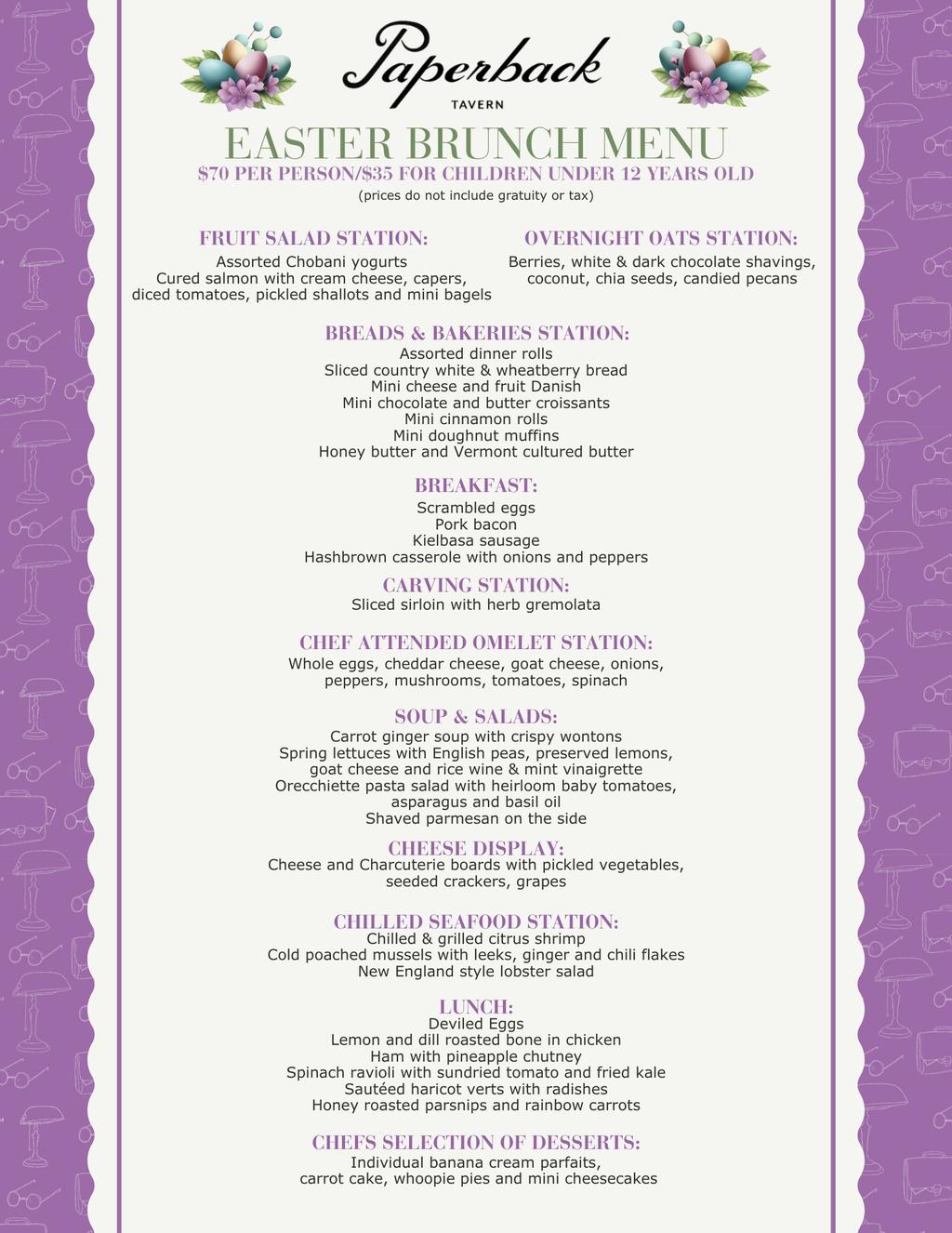 Enjoy Easter brunch at Paperback Tavern, located inside of Hyatt Regency Boston/Cambridge, Sunday, Mar. 31. The buffet is $70 for adults and $35 for kids (ages 4–12 years old). There is no charge for children 3 years and under. Prices do not include gratuity or tax. Reservations are encouraged as specific seating times may not be available without one. For parties of eight or more, please email marielle.boucher@hyatt.com and christopher.thomas1@hyatt.com for more information.