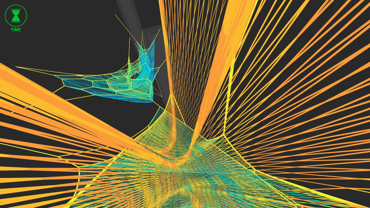 Janet Echelman’s Remembering the Future widens our perspective in time, giving sculptural form to the history of the Earth’s climate from the last ice age to the present moment, and then branching out to visualize multiple potential futures. Constructed from colored twines and ropes that are braided, knotted and hand-spliced to create a three-dimensional form, the immersive artwork greets visitors with its grand scale presiding over the MIT Museum lobby.