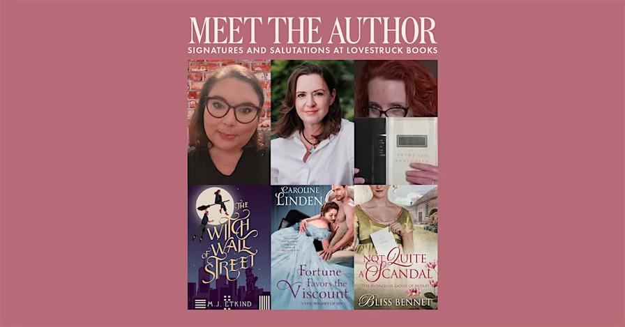 Experience the next “Meet The Author” event at Lovestruck Books. This events series gives guests the opportunity to meet with their favorite author, purchase books directly from them, and have a copy signed! This signing on Sunday, April 6 from 1-3 PM will feature M.J. Etkind, Caroline Linden, and Bliss Bennet with copies of their recent release as well as an assortment of backlist titles. This event is free but guests are encouraged to RSVP on eventbrite to attend.
