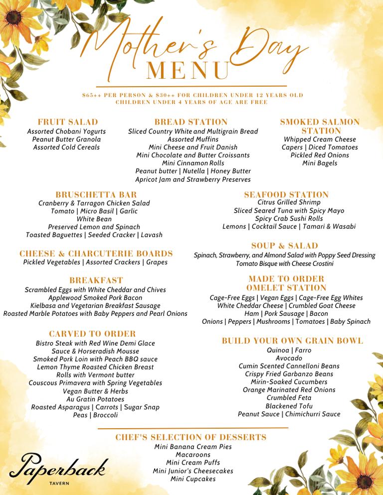 Celebrate Mother's Day with a buffet brunch on Sunday, May 12. Paperback Tavern's special brunch will feature a carving station, chef prepared omelets station, and more brunch favorites. Reservations are required and can be made on Resy.com or by emailing marielle.boucher@hyatt.com. The cost is $65+ for adults and $30+ for kids. There is no charge for children ages 4 and under. Parties of eight or more should email marielle.boucher@hyatt.com for more information. Parking is complimentary for buffet guests, and guests should ask their server for a parking pass. Cancellations made before May 9 will not be charged, after which there is a cancellation fee of $25 per person. Reservations not honored the day of are responsible for the full charge.
