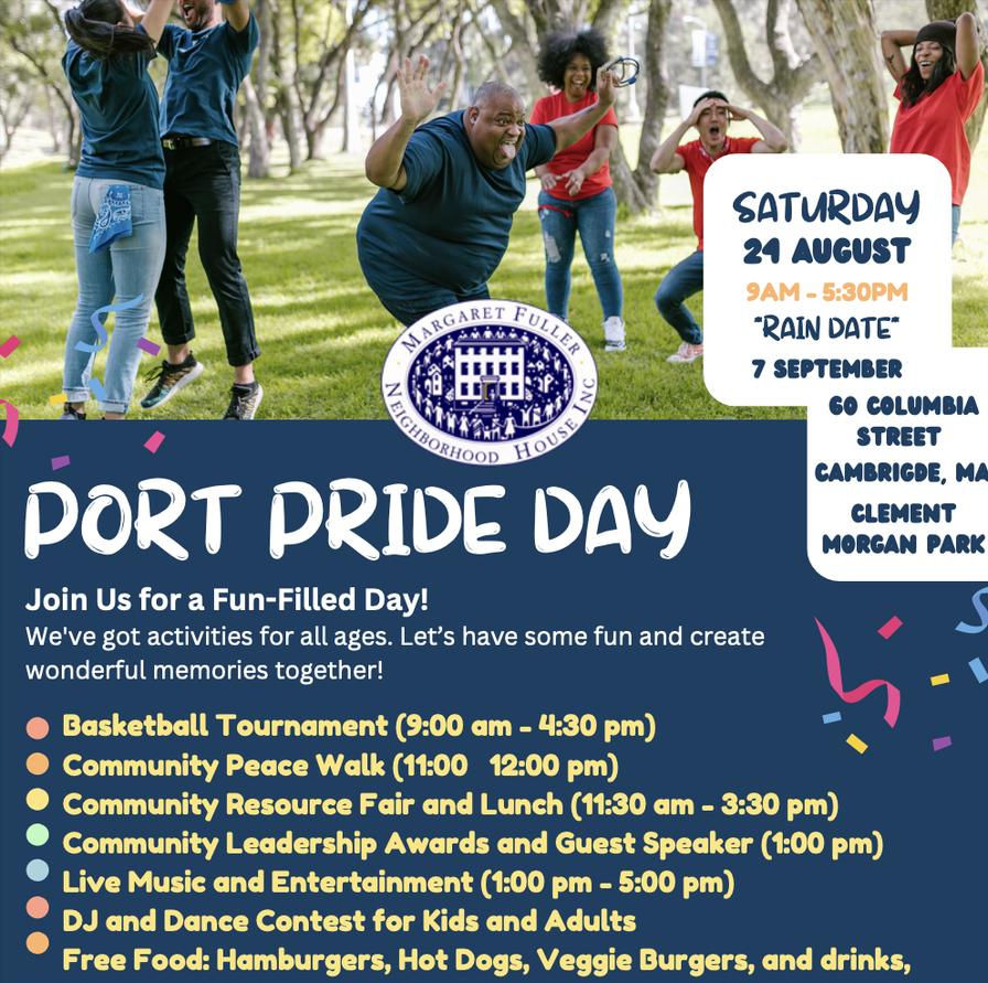 All are invited to Port Community Pride Day Block Party on Saturday, Aug. 24. Port Pride Day celebrates diversity, resilience, and strength represented in the Cambridge community. It's a fantastic opportunity for neighbors to come together for a day filled with fun, food, and festivities.