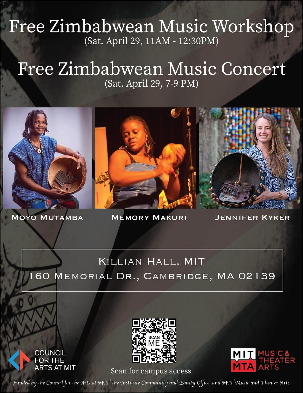 Participate in a free Zimbabwean music workshop with visiting musicians Moyo Mutamba, Jennifer Kyker and Memory Makuri on Saturday, April 29! Teaching will be appropriate for all skill levels. Don’t miss the chance to meet and learn from three amazing instructors and musicians. Dr. Moyo Mutamba is a professor at the University of Waterloo in Canada and is an expert on indigeneity and decolonization, as well as being well-versed in Shona music and culture. Dr. Jennifer Kyker is an ethnomusicologist at the University of Rochester and is one of the most experienced US mbira players, having performed and taught mbira for over 15 years. Memory Makuri is a world-renowned artist and one of few women who have forged careers in the Zimbabwean music industry. She has performed with numerous Zimbabwean groups, including the legendary band, Thomas Mapfumo and the Blacks Unlimited. This program is funded by Council for the Arts at MIT, MIT Music & Theater Arts as well as MIT Institute Community and Equity Office.