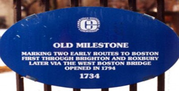 This milestone marks two early routes to Boston: first through Brighton and Roxbury, and later via the west. Boston Bridge opened in 1794.