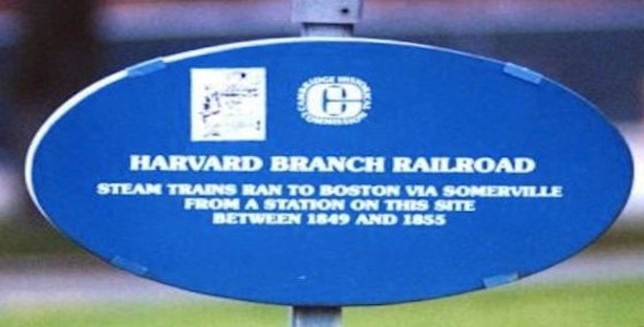 The Harvard Branch Railroad was a short-lived branch from the Fitchburg Railroad to Harvard Square and Harvard University in Cambridge, Massachusetts. Steam trains ran to Boston via Somerville from a station on this site between 1849 and 1855. On April 19, 1854 it was authorized to abandon the line, and did so in 1855.